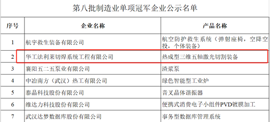 近日,工業(yè)和信息化部公示了第八批制造業(yè)單項(xiàng)冠軍企業(yè)遴選認(rèn)定和第二批、第五批制造業(yè)單項(xiàng)冠軍企業(yè)名單,華工科技子公司華工法利萊熱成型三維五軸激光切割裝備榮獲“國家級(jí)制造業(yè)單項(xiàng)冠軍產(chǎn)品”稱號(hào),目前華工科技已有三項(xiàng)產(chǎn)品獲此榮譽(yù)。