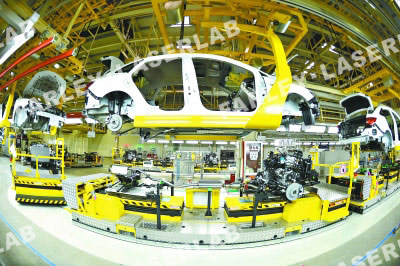總裝車間,流水線上進(jìn)行汽車底盤和車身安裝
