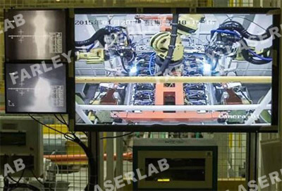 在車身車間,機(jī)器人正在進(jìn)行總拼增焊工序,該車間擁有452臺(tái)機(jī)器人,自動(dòng)化率高達(dá)97%