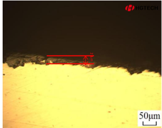 制動盤所用材料為Q345E,根據國標GB8923-88的標準,對零件銹蝕程度進行判斷,發(fā)現(xiàn)鋼材表面已發(fā)生銹蝕,并且部分氧化皮有銹蝕,因此判斷零件銹蝕等級為B級。經多次取平均值,測量得到銹層平均厚度約為23μm(如下圖2)。通過材料表面銹蝕程度分析,發(fā)現(xiàn)表面銹蝕程度不均勻,這是由于制動盤在工作運行中對表面的磨損與銹蝕程度不同造成的。