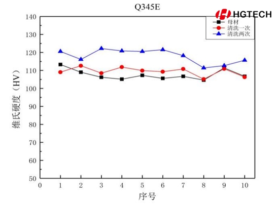 通過清洗前后基材表面硬度值的分布趨勢進行分析。依據上圖4,清洗后基材表面硬度值分布趨勢較為波動,但是硬度平均值高于母材的硬度值??梢园l(fā)現(xiàn)經過激光清洗兩次后的表面顯微硬度與母材相比提高了約8%。激光除銹能提高碳鋼表面的硬度,對防止碳鋼再次氧化和表面強化具有重要意義。