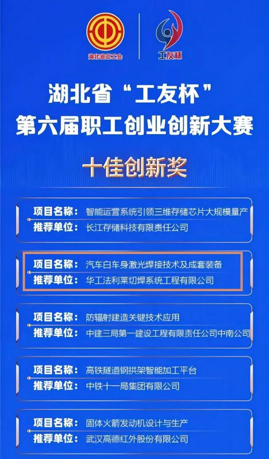 近日,湖北省第六屆“工友杯”職工創(chuàng)業(yè)創(chuàng)新大賽決賽結(jié)束。華工科技核心子公司華工法利萊選送的汽車白車身激光焊接技術(shù)及成套裝備項(xiàng)目,獲“十佳創(chuàng)新獎(jiǎng)”第二名。
