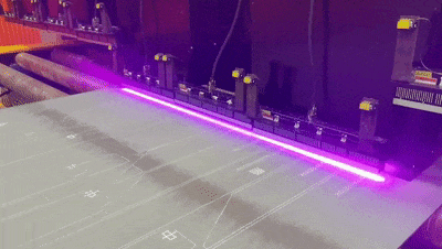 傳統(tǒng)生產(chǎn)流程中,板材下料后,工人需要在板材上手寫船號(hào)、分段號(hào)、零件號(hào)等信息?!爱嫛币粡堥L12米、寬4米的板材,需要二十分鐘。而這臺(tái)全面劃線機(jī)替代人工手寫,就像一臺(tái)全自動(dòng)“鋼板”打印機(jī),裝有多個(gè)噴碼頭,2分鐘內(nèi)就能將所需信息一次性噴印在同樣大小的鋼板上。