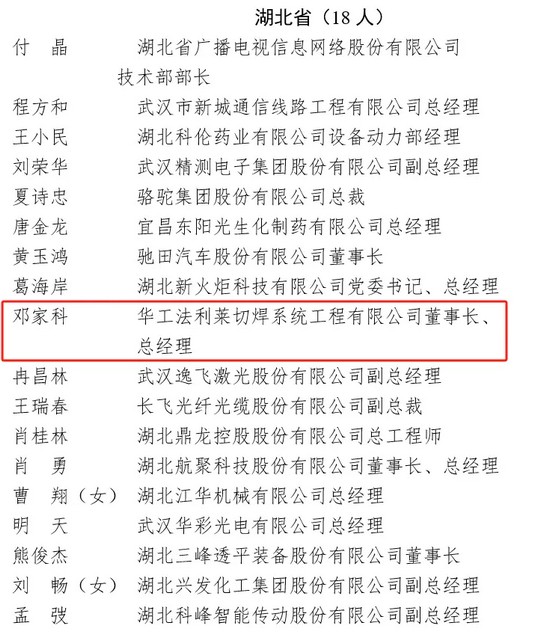 近日,工業(yè)和信息化部對全國工業(yè)和信息化系統(tǒng)先進集體、勞動模范和先進工作者擬表彰對象名單進行公示,華工科技核心子公司孝感華工高理電子有限公司(以下簡稱“華工高理”)入選“全國工業(yè)和信息化系統(tǒng)先進集體”,華工科技子公司華工法利萊切焊系統(tǒng)工程有限公司(以下簡稱“華工法利萊”)董事長、總經(jīng)理鄧家科入選“全國工業(yè)和信息化系統(tǒng)勞動模范”。