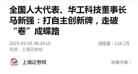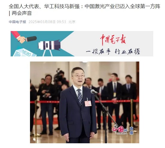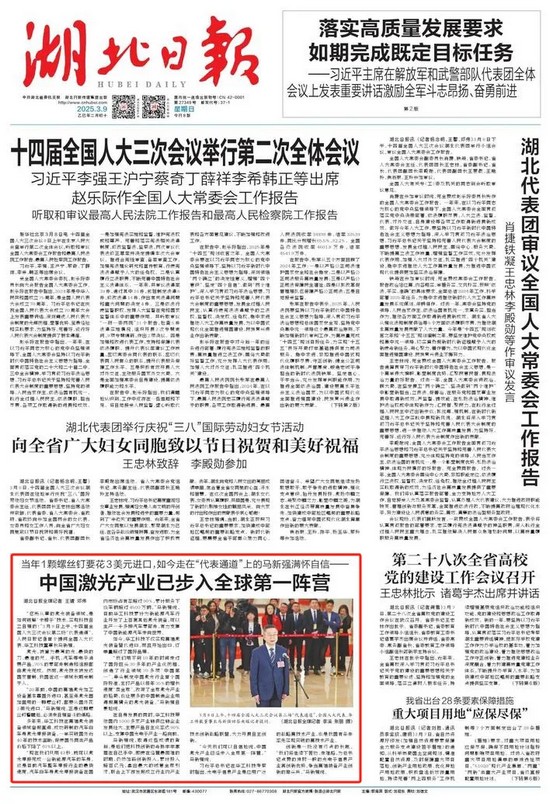 人民日報(頭版)、新華社《新華每日電訊》、中央電視臺《新聞聯(lián)播》、科技日報、工業(yè)和信息化部宣傳中心、中國電子報、中國工業(yè)報、中國證券報、上海證券報、證券時報、證券日報、每日經(jīng)濟(jì)新聞、經(jīng)濟(jì)觀察報、第一財經(jīng)、支點(diǎn)財經(jīng)、湖北日報(頭版)、長江云新聞等多家媒體關(guān)注馬新強(qiáng)代表的履職情況及華工科技創(chuàng)新發(fā)展。