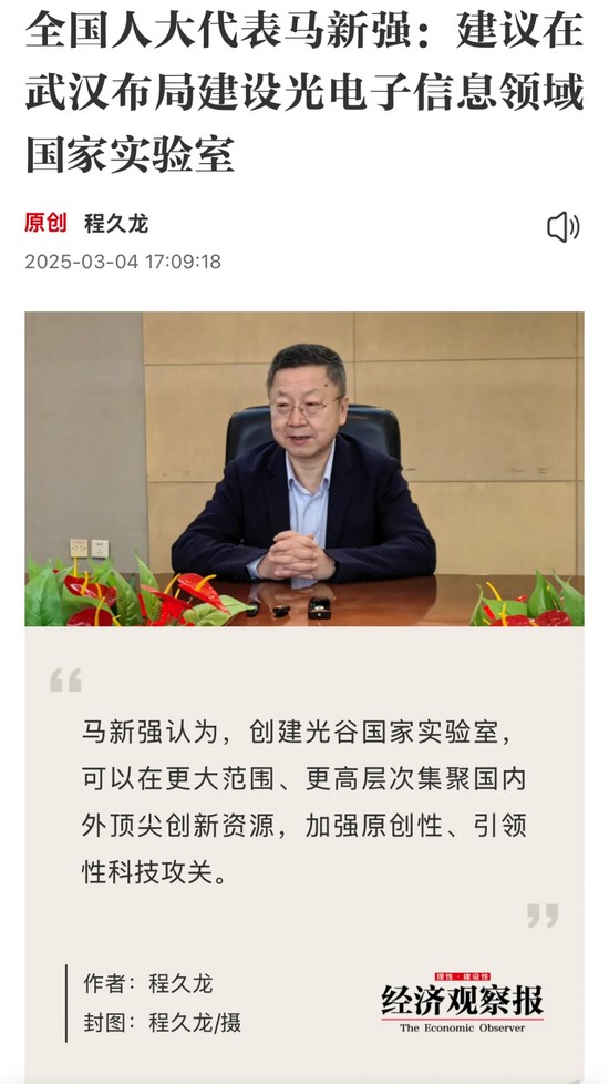 為提升光電子信息領(lǐng)域創(chuàng)新策源功能,塑造光電子信息產(chǎn)業(yè)國際競爭新優(yōu)勢,全國人大代表、華工科技董事長馬新強(qiáng)建議,國家層面要加強(qiáng)光電子領(lǐng)域國家實(shí)驗(yàn)室的布局。他建議國家科技部支持武漢以華中科技大學(xué)、湖北光谷實(shí)驗(yàn)室、武漢光電國家研究中心為基礎(chǔ),協(xié)同湖北九峰山實(shí)驗(yàn)室、湖北江城實(shí)驗(yàn)室以及華為武漢研究所等優(yōu)勢力量,創(chuàng)建光谷國家實(shí)驗(yàn)室。