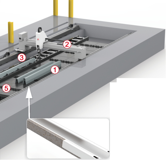 ⑤ 清洗作業(yè)完成后,U肋原路返回上料區(qū)域,由移載機(jī)構(gòu) 進(jìn)行卸料。U肋進(jìn)入存放架,至此一個(gè)作業(yè)循環(huán)完成。