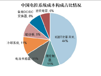 電控系統(tǒng)是新能源汽車的“大腦”,控制整個車輛的運(yùn)行與動力輸出,主要由逆變器、逆變驅(qū)動器、電源模塊、中央控制模塊、軟起動模塊、保護(hù)模塊、散熱系統(tǒng)信號檢測模塊等組成,其中逆變器負(fù)責(zé)蓄電池的直-交轉(zhuǎn)換,從而驅(qū)動電機(jī)運(yùn)轉(zhuǎn)。其中IGBT功率半導(dǎo)體模塊應(yīng)用于逆變器中,是新能源汽車電控系統(tǒng)和直流充電樁的核心器件,被稱為電力電子的“CPU”,占整個控制器成本的40-50%左右。